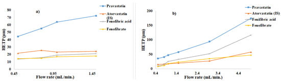 From the Van Deemter diagram, it can be seen that the separation efficiency in the monolithic column decreases as the flow rate increases, while in the UHPLC column, the reduction in the separation efficiency only occurs in Pravastatin, while for the other compounds, the separation efficiency was almost the same. Although the separation efficiency in the UHPLC column was stable at different flow rates, the backpressure increases sharply as the flow rate increases. Therefore, the monolithic column is more convenient, because it allows the resolution of compounds at high flow rates, thus shortening the analysis time.