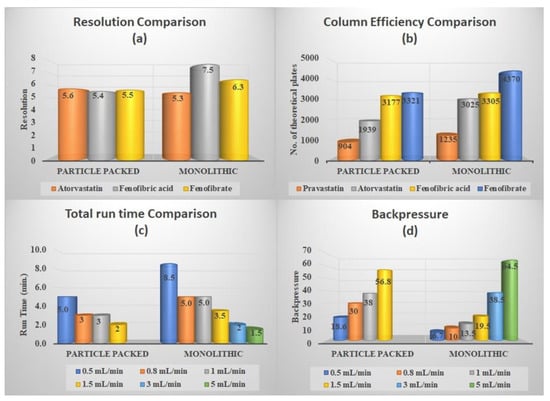 Figure 6, comparisons are made with respect to resolution, column efficiency, backpressure, and total analysis time. In terms of resolution, column efficiency, and backpressure, the monolithic column shows better results than the UHPLC column. However, at the same flow rate, the particle-packed UHPLC column showed better results in terms of method run time.