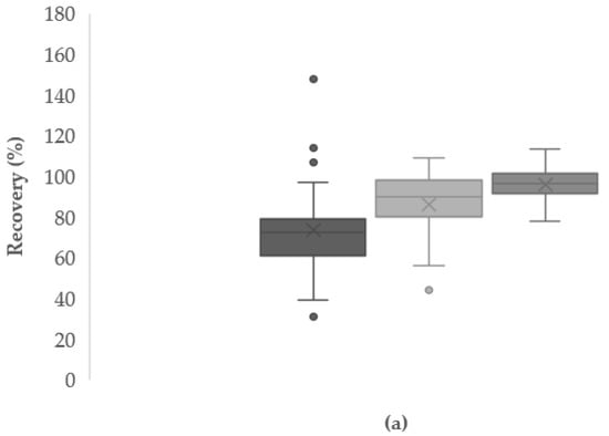 In a first approach, Oasis HLB was used at different pH values (4.0, 6.0, and 9.0) in order to check which pH allowed the preconcentration and subsequent detection of the maximum of compounds with the highest recovery. The recoveries for each condition are shown in Figure 1 as box plots.