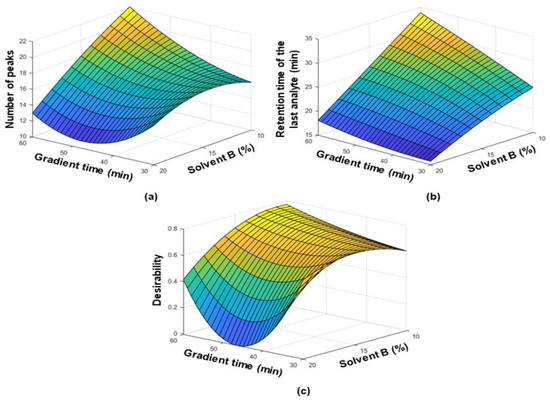 On the one hand, experimental factors to be considered were the initial percentage of solvent B and the gradient time (to reach 40% solvent B). In this way, the experimental plan consisted of a 2 factor at 3 level full factorial design, involving 9 runs, in which the initial percentage of solvent B was studied at 10, 15 and 20% and the gradient time at 30, 45 and 60 min. In all cases, a further cleaning and conditioning step was added after the separation stage, in which the solvent B percentage increased up to 85%, was maintained at this percentage for 5 min, and returned to the initial conditions for column stabilization. Experiments were carried out randomly to avoid the influence of systematic drifts on the results.