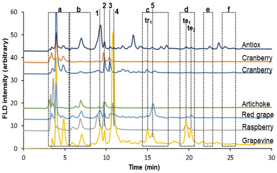 Representative chromatograms of various nutraceutical samples obtained by the HILIC with fluorescence detection. Sample assignation: deep blue = antiox; orange = cranberry; blue = cranberry (combined); green = artichoke; light blue = red grape (peel and seeds); grey = raspberry and yellow = grapevine. Compound assignation from standards: 1 = catechin; 2 = epicatechin; 3 = procyanidin A2; 4 = procyanidin B2 and 5 = procyanidin C1. Tentative compound assignation: a = phenolic acids; b = other flavonoids; c = trimers (tr1 = trimer 1); d = tetramers (te1 = tetramer 1; te2 = tetramer 2); e = pentamers and f = hexamers.