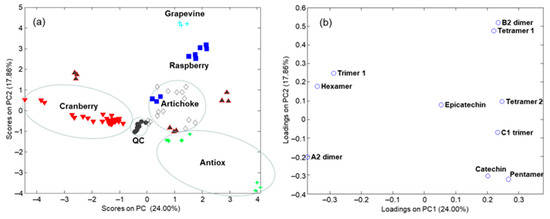 Characterization of nutraceuticals and dietary supplements by principal component analysis (PCA) using the compositional profiles of flavanols as the data. (a) Scatter plot of scores of PC1 vs. PC2; (b) scatter plot of loadings of PC1 vs. PC2. Sample assignation: triangle (vertex down) = cranberry; triangle (vertex up) = red grape; rhombus = artichoke; cross = grapevine; square = raspberry; asterisk = antiox and circle = QCs.
