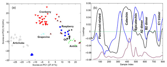 PCA results from the filtered dataset are depicted in Figure 4. As can be seen, cranberry and artichoke samples were found in compact groups on the top and left parts of the graph, respectively, which suggested that the composition of these samples was quite homogenous within each class. Some raspberry samples as well as antiox and red grape products were distributed on the right side of the graph. The study and interpretation of the loading vectors here were more complex. In this regard, catechin seemed to have a high weight in PC1 while procyanidin A2 and epicatechin mainly influenced PC2 (see Figure 4b).