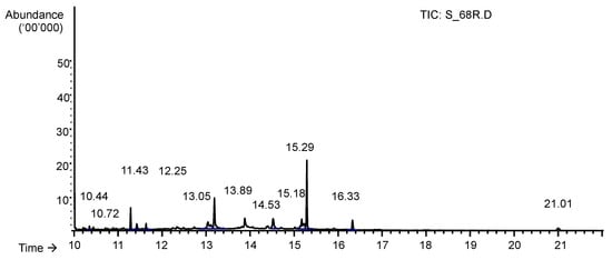 The graph shows gas chromatography-mass spectrometry (GC-MS) chromatogram for Fraction 8, of which 9 out of 10 identified compounds were further investigated to determine antimycobacterial activity. Samples were analyzed using Agilent 7890 A GC system with constant flow rate of helium gas at 2 mL/min, 1 µL of injection volume, electron ionization system with 70 eV of ionizing energy, with inlet and detector temperature of 280 °C.