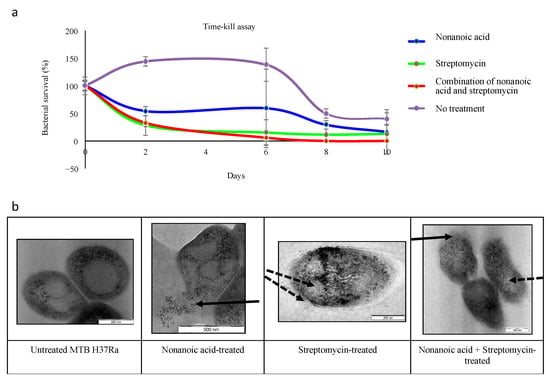 (a) Time–kill assay of Mycobacterium tuberculosis (MTB) H37Ra treated with nonanoic acid (50 µg/mL) and streptomycin (1.56 µg/mL). A total of 99% of bacterial cells were killed by a combination of nonanoic acid and streptomycin (red line) compared to 87% by streptomycin alone on Day 7. Each treatment condition contained 0.5 mL inoculum per 5 mL culture, and incubated at 37 °C in 4% CO2 with swirling for 10 days, and periodically sampled for plate counting; (b) Cross-sectional view of MTB H37Ra under a transmission electron microscope (TEM). TEM images show cross-sectional cell wall damage and cellular leakage of nonanoic acid-treated cells (12,500× magnification) and streptomycin-treated cells (25,000 × magnification); nonanoic acid- and streptomycin-treated cells (20,000× magnification) compared to untreated cells (10,000 × magnification). Notes: Treatments in the time-kill assay are based on their respective MIC values. Solid arrows indicate leakage of cellular components and dashed arrows indicate damaged cellular components and cell wall.