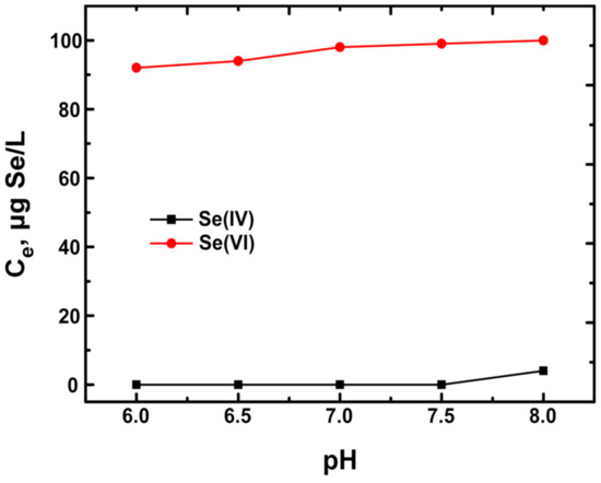 The previously published relevant experimental results [8] showed the good adsorption efficiency of Se(IV) by several iron oxy-hydroxides, achieving residual concentrations at sub-ppb level within the common pH range (6–8), existing in most natural waters [8]. In contrast, the respective uptake capacity for the case of Se(VI) was verified as extremely low and almost zero for some of the examined adsorbents. To clarify further the pH effect, regarding the selective adsorption of Se(IV) only, 2 g FeOOH/2.5/L was added to a solution containing initial concentrations either of 100 μg Se(IV)/L or of 100 μg Se(VI)/L in NSF water matrix and were stirred gently for 1 h. According to the obtained experimental results (Figure 1), equilibrium (i.e., residual) concentrations below the detection limit of 1 μg Se(IV)/L were determined for pH values lower than 7.5, while at higher pH values, the Se(IV) was not fully adsorbed/separated/removed from the aqueous solution. Figure 1 also shows that for the initial concentration of 100 μg Se(VI)/L, minor adsorption/separation takes place at pH values lower than 7, while at higher pH values, almost zero adsorption was observed, since equilibrium concentrations equal to the initial Se(VI) concentration of 100 μg/L were determined. In conclusion, the optimum pH range for the selective Se(IV) adsorption/separation is between 7 and 7.5. Thus, the experiments to verify the optimum adsorbent type, adsorbent quantity, and contact time were subsequently performed at the pH value of 7.3 ± 0.2.