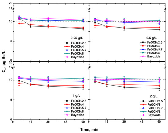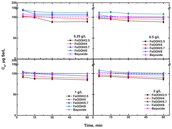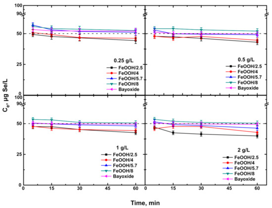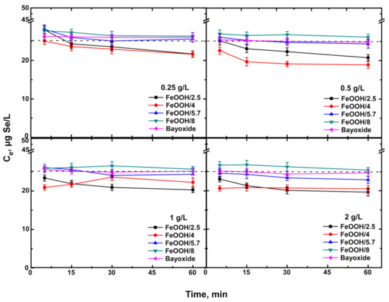 - At the higher doses of 0.5, 1, and 2 g/L, the FeOOH/8 showed the insufficient uptake of Se(IV), whereas the Bayoxide presented complete Se(IV) uptake. In contrast, the adsorbents FeOOH/2.5, FeOOH/4, and FeOOH/5.7 showed the adsorption of both species.