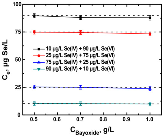 The different initial concentrations of Se(IV) and of Se(VI) in NSF water samples were subsequently examined to verify the selective adsorption of Se(IV) by the qualified adsorbent Bayoxide. Figure 6 presents the data regarding the selective adsorption of Se(IV) in water samples, containing 100 μg/L total selenium, for the Bayoxide doses of 0.5, 0.7, and 1 g/L at pH 7.3 ± 0.2 and 30 min contact time. The experimental results indicate that the selective separation (and speciation) of selenium species can be effectively achieved in the aforementioned optimized conditions using the 0.5 g/L Bayoxide dose. The equilibrium concentrations, i.e., the residual concentrations of dissolved selenium, correspond to the initial concentrations of Se(VI) in the examined water samples, indicating indirectly that only the Se(IV) was able to be completely adsorbed (and separated) by the applied adsorbent from the aqueous mixtures of selenium species.