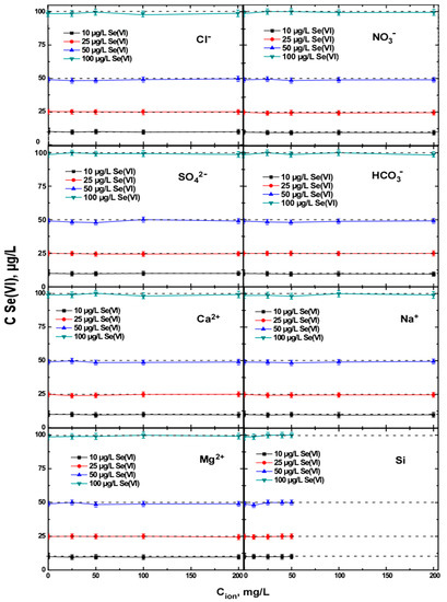 In contrast, all the adsorption experiments with Se(IV) resulted in equilibrium/residual concentrations below the method’s detection limit (1 μg/L)—see also Figures S1–S3 in the Supplementary Material, thus verifying the complete uptake/separation of Se(IV). Therefore, the effective adsorption, separation, and determination of main inorganic selenium species were not influenced from the presence of major commonly co-existing ions and for the concentration ranges usually found in natural waters.