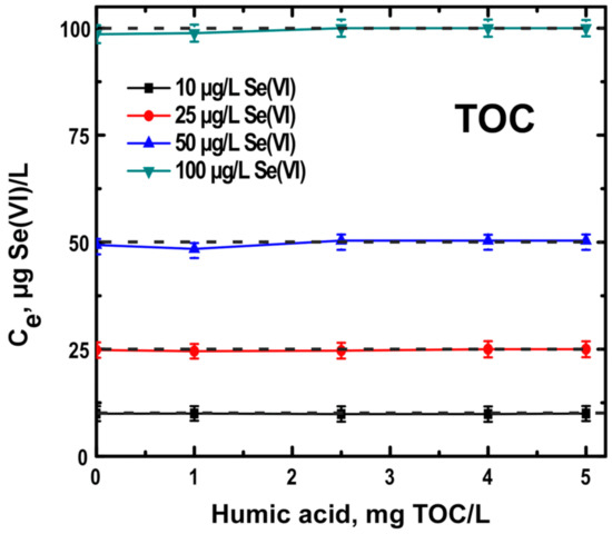 Influence of commonly found in natural waters NOM concentrations (as determined by TOC) on Se(VI) adsorption by Bayoxide. Experimental conditions: Bayoxide concentration 0.5 g/L, initial Se (VI) concentration range 10–100 μg/L, pH 7.3 ± 0.2, temperature 20 °C, and contact time 30 min.