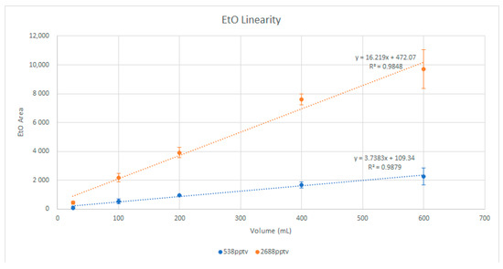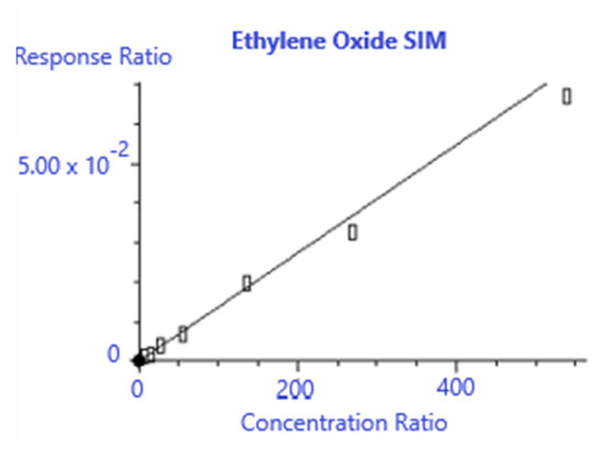 Figure 1 shows the graph of the EtO linearity study, showing good linearity up to a 600 mL injection. However, 400 mL was chosen as the nominal injection volume, because it provided the best balance of sample load time and targeted sensitivity. Future researchers may wish to extend the sample volume to 600 mL or more if the desired sensitivity is not achieved at 400 mL.