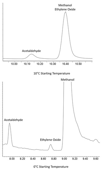 EtO separation from MeOH at 10 °C (top) and 0 °C (bottom) using an Rxi-624Sil MS column.