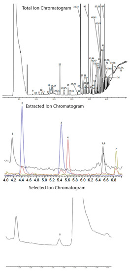 Combined TO-15A and EtO chromatograms. TO-15A compounds at 200 pptv, EtO at 50 pptv, and internal standards at 5000 pptv. Top chromatogram is the Total Ion Chromatogram (TIC), second trace is the Extracted Ion Chromatograms (EIC) for compounds 1–7 (m/z 41, 85, 135, 50, 43, 65, and 54), and the bottom trace is the Selected Ion Monitoring (SIM) trace for EtO (m/z 29).