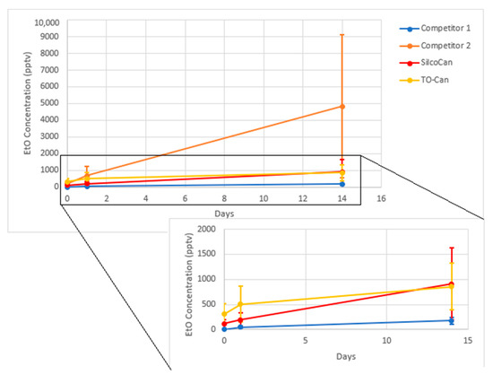 Ethylene Oxide growth over time. Average of 3 canisters for each data point, error bars are 1 standard deviation. Insert excludes Competitor 2.