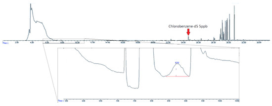Examination of humid air blanks of heavily used canisters showed high initial levels of EtO. Figure 7 shows the chromatogram of a canister with high levels of contamination from unknown, non-target compounds. The contaminant peaks are over ten times the area of the nearest eluting internal standard compound, chlorobenzene-d5, and the EtO concentration is 5.9 ppbv.