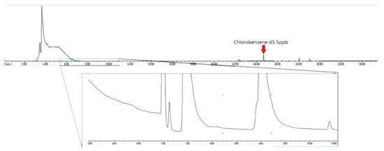 Chromatogram of contaminated air canister post-proprietary cleaning. Insert–SIM trace of m/z 29. EtO concentration–<LOQ.