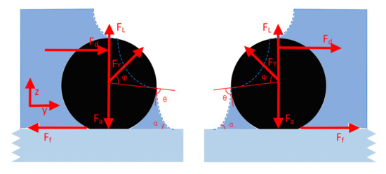 The tension formed by the contact between the gas–liquid interface and the particles is , the angle between the tension formed by the liquid surface and the particle liquid surface when the gas–liquid interface advances or retreats is , and the liquid surface and the particle liquid surface form tension when the gas–liquid interface advances or retreats, which has a complementary angle of . When < , the surface tension is toward the center of the particle, and when > , the surface tension is away from the center of the particle. For the case where α < 90° [13,14], Fγ reaches its maximum value at = /2. The maximum surface tension in the z direction is , and the maximum surface tension in the y direction is . It can be understood as the following formula: