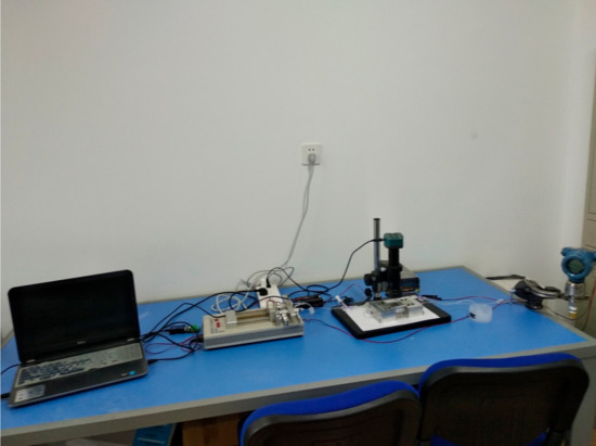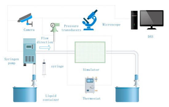 The schematic diagram of the experimental device for particle migration in non-Newtonian fluid bubble motion is shown in Figure 4. It is mainly composed of a fluid reservoir, syringe pump, injector, pressure sensor, flat simulation device, microscope, video recorder, information acquisition system, and temperature controller. The fluid reservoir is used to provide and collect the test–use sub-Newtonian fluid. The syringe pump pushes the syringe with a stable speed piston to make the injection liquid speed constant, and the pump injects the non-Newtonian fluid into the flat simulation device at a stable flow rate. The injector is connected to the pipeline through a three-way valve. Usually, the tee and injector channels are closed. When gas needs to be introduced, the three-way and ejector channel are opened. The injector injects a certain amount of gas into the system to create a gas–liquid interface in the simulation device. The pressure sensor measures the injection pressure at the inlet, and the microscope and video recorder observe and record the particle migration. The information collection system collects and records various data in the experiment. The temperature controller uses a civil air conditioner to keep the temperature in the test state within the required range. The experimental device diagram is shown in Figure 5.
