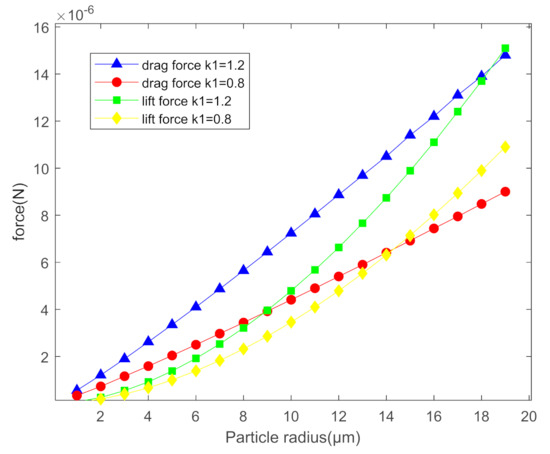 Non-Newtonian fluids have an impact on the starting conditions of particle migration due to their own properties. Different from Newtonian fluid, both the fluidity index and the consistency coefficient in non-Newtonian fluids will have a certain effect on the migration of particles. As shown in Figure 7, when k1 is 1.2 and n is 0.57 in a non-Newtonian fluid, the curve moves up significantly.