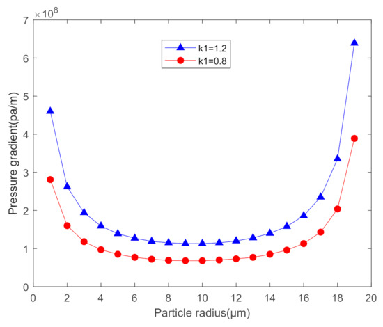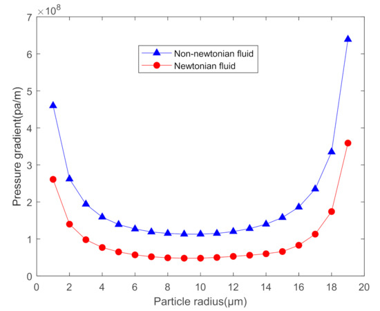 - As shown in Figure 9, the consistency coefficient has a significant effect on the pressure gradient curve. The increase in the consistency coefficient causes the pressure gradient curve to move upwards horizontally, and the lowest point of the conditions for particle activation rises. When H = 40 μm, n = 0.57, and K1 increases from 0.8 to 1.2, the lowest point of the pressure gradient curve becomes 166% of the original.