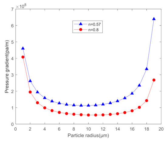 - As shown in Figure 8, the increase in fluidity index has an impact on the starting conditions of the particles. As the fluidity index increases, the pressure gradient curve decreases overall. When H = 40 μm, K1 = 1.2, and n increases from 0.57 to 0.8, the minimum pressure gradient in the pressure gradient curve is reduced by 51%.