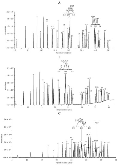 Total ion chromatograms of the CRM47741 fatty acid methyl ester mixture using the (A) non-polar HP-5MS column, (B) the medium/high polar DB-225MS column and (C) the extremely polar, ionic liquid-based SLB-IL111 column. The peak labels indicate components listed in Table 2 according to the retention order in the separation with the HP-5MS column. The optimized experimental conditions are detailed in Materials and Methods. Total FAME concentration is 80.6 µg mL−1.