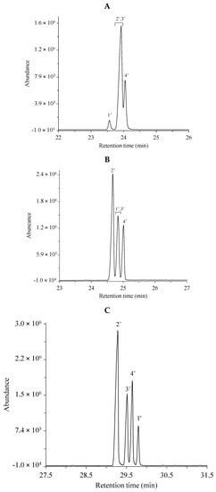 The polyunsaturated (methyl linoleate) geometric isomers could be completely separated only with the SLB-IL111 column (Figure 2C), and no baseline separation of the four C18:2 geometric isomers (cis-cis, cis-trans, trans-cis, trans-trans) could be observed with the other two separation phases (Figure 2A,B).