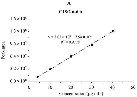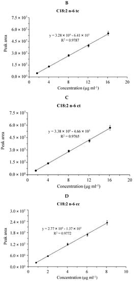 Calibration plots for fatty acid methyl esters in the CRM47741 mixture. Cumulative graph of the assay in the range of 0.008–0.08 mg mL−1 with 5 points of calibration in three (n=3) separate calibrations, mean values of calibration concentrations represented by dots and ±SDs. (A) C18:2n-6tt, (B) C18:2n-6tc, (C) C18:2n-6ct and (D) C18:2n-6cc analyzed by the SLB-IL111 GC column.