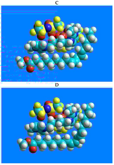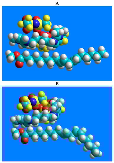 In order to demonstrate the interactions between the 1,5-di(2,3-dimethylimidazolium)pentane bis(trifluoromethylsulfonyl)imide ionic liquid and the geometric isomers of linoleic acid methyl ester (C18:2n-6tt, C18:2n-6tc, C18:2n-6ct, and C18:2n-6cc), possible positions of the two molecules were constructed using the HyperChem 7.51 software (HyperChem(TM) Professional 7.51, Hypercube, Inc., 1115 NW 4th Street, Gainesville, FL, USA). Geometry optimization of the molecules displays the structures with minimum energy, i.e., the most stable form of the chemical structure. As an initial step, the molecules were created individually and then optimized by the method of MM+ molecular mechanics force field [24]. After creating the molecular systems, the relative positions of the two molecules were optimized with the same MM+ method.