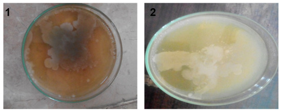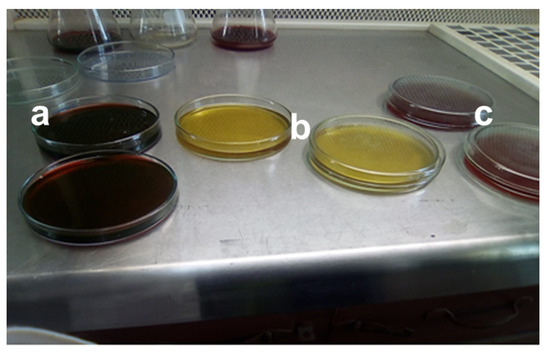Industrial effluent, specifically mango juice effluent, was taken from the private beverage industry named Rifson foods with product code (20097900), located at Multan, Punjab, Pakistan. After collecting the wastewater effluent sample, it was homogenized for 30 s in the centrifuge device. The homogenized sample was taken into the 250 mL beaker for more accuracy and reproducibility, and gently stirred with a magnetic stirring plate. The total viable count was performed using the spread plate technique on three different agars, nutrient agar (NA), eosin methylene blue (EMB) agar, and MacConkey agar. The selection of media generally depended on which microbe was being selected, because different microorganisms require different environments and growth conditions (e.g., nutrients, pH, and temperature) for their growth. In the above-mentioned agars, NA was composed of beef extract 3 g, NaCl 8 g, peptone 5 g, agar 15 g, and water as required to make it 1 L. To 100 mL of deionized water, 5.6 g of nutrient agar was added with water mixture and further heated at 100 °C. For EMB agar, 3.6 g of EMB agar was added to 100 mL of deionized water to prepare 100 mL of solution and mixed well with the help of an electronic stirrer. Similarly, for the preparation of 100 mL MacConkey agar, 5 g of MacConkey agar was added to 100 mL of deionized water and further heated to get a homogenized solution. All the agars were autoclaved for 15 min at 15 psi to sterilize culture media. Almost 100 mL of the mixture was poured into petri dishes, and for solidification, the petri dishes were placed in the laminar flow cabinet to maintain the anaerobic conditions and then placed in the incubator at a temperature of 37 °C for 24 h, as shown in Figure 1.