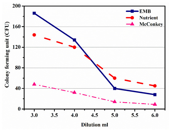 The microbial growth was analyzed in terms of colony-forming units on different agars such as EMB, NA, and MacConkey. It was observed that colony-forming units decreased with the increase in the number of dilutions from 103 to 106, as shown in Table 3. It was seen that about 10 to 300 colonies per petri dish were grown when removed from the incubator. Moreover, it can be seen in Table 3 that the value of CFU decreased with an increase in the dilutions, which was due to the reduction in the growth of microbes.
