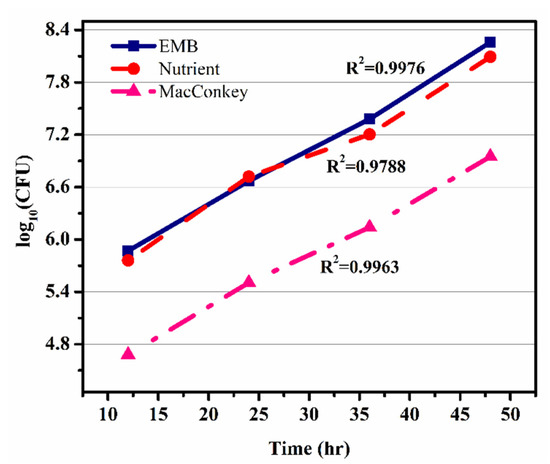 Figure 6 shows the graph between time (h) vs Log10 (CFU) of microbial growth on all three agars, i.e., EMB, nutrient, and MacConkey. The growth rate of microbes was calculated from the slope of Figure 6 (graph of time against log10 (CFU)). The growth rate (μm) was calculated as 0.03833 h−1, which was further used for the calculation of the specific growth rate (μ) using the Monod equation. In Figure 6 the graph shows the colony growth rate in terms of log10 (CFU) on EMB, MacConkey, and nutrient agars. Figure 6 shows that the minimum colony growth was on the MacConkey agar, and the colony growth on the EMB media was higher compared to the nutrient agar. The calculations of colony growth showed the highest growth of colonies on the EMB agar, as shown in Table 2 and Table 3.