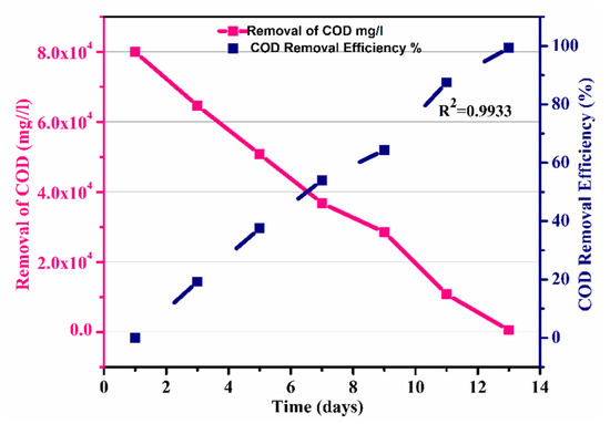 Removal of COD and efficiency of the process over time.
