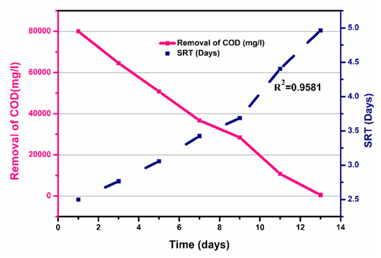 Solid retention time (SRT), substrate removal, and COD removal efficiency with time.