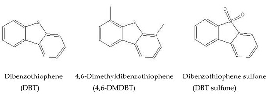 Chemical structures of the studied thiophenic compounds: dibenzothiophene (DBT), 4,6-dimethyl-dibenzothiophene (4,6-DMDBT), and dibenzothiophene sulfone.