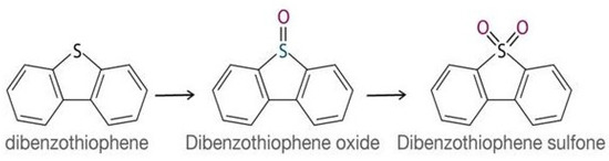 Additionally, either oxygen of these carbons’ surface oxygen functional groups or chemisorbed oxygen may take part in reactions that lead to the oxidation of adsorbed DBT and 4,6-DMDBT on the carbon’s surface to their sulfoxides and finally sulfones with the portion of 4,6-DMDBT oxidation to be less compared to DBT oxidation [17,18,20,22]. The DBT sulfone is formed according to the oxidation reaction route shown in Figure 2 [23,24].
