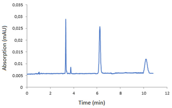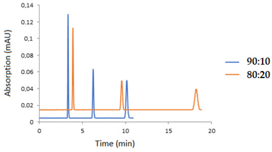 The separation of the target compounds was performed by the High-Performance Liquid Chromatography (HPLC) method, using an HPLC column 250 × 4.6 mm (PerfectSil Target ODS-3 5 μm, MZ-Analysentechnik GmbH, Wohlerstrasse, Mainz, Germany) with a mobile phase consisted of a solution of acetonitrile and water (90% CH3CN: 10% H2O v/v) delivered isocratically at a flow rate of 1.0 mL/min, using a Shimadzu (Kyoto, Japan) LC-10AD pump. The pressure observed was 80 bar. Sample injection was performed via a Rheodyne 7125 injection valve (Rheodyne, Cotati, CA, USA) with a 20 μL loop. Detection was achieved by an SSI 500 UV-Vis detector (SSI, State College, PA, USA) at a wavelength of 313 nm and a sensitivity setting of 0.002 AUFS. DAQ Software for Chemists, developed by Emeritus Professor P. Nikitas (Dept. of Chemistry, Aristotle University of Thessaloniki).