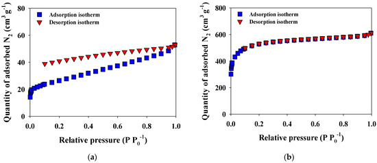 N2 adsorption-desorption isotherm curves of the (a) peanut shell biochar (PSB) and (b) KMnO4 and KOH modified PSB (PSBOX-A).