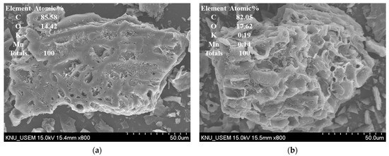 The SEM images of PSB and PSBOX-A are shown in Figure 2. The surface of PSB is smooth and flat, but PSBOX-A has porous and uneven structures. These results indicate that chemical modification using KMnO4 and KOH might change the surface morphology of the PSB with respect to the adsorption of fungicides [27]. The SEM–EDX results of PSB and PSBOX-A demonstrated the effect of chemical modification with KMnO4 and KOH on the differences in the constituents of PSB and PSBOX-A. The PSBOX-A was composed of C (82.05%), O (17.62%), K (0.19%), and Mn (0.14%). However, PSB only consisted of C (85.58%) and O (14.42%). The presence of K and Mn atoms in PSBOX-A could explain why K and Mn were combined on the surface of PSB during the successive chemical modification using KMnO4 and KOH.