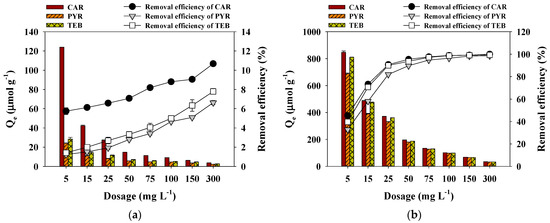 Effects of adsorbent dosages on the removal efficiency of CAR, PYR, and TEB by (a) PSB and (b) PSBOX-A (agitation speed = 150 rpm; initial concentration of each fungicide = 10 μM; contact time = 24 h; temperature = 25 °C; pH = 7.0).