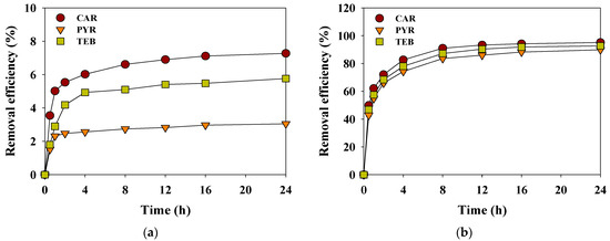 Figure 5 shows the adsorption kinetics of CAR, PYR, and TEB when using PSB and PSBOX-A. The fast adsorption reaction was completed within 4 h for fungicides on the PSB and PSBOX-A surfaces. After 4 h, the removal efficiencies of CAR, PYR, and TEB were increased by PSB and PSBOX-A because the activated binding sites on PSB and PSBOX-A surfaces were saturated [12]. The removal efficiencies of CAR, PYR, and TEB by PSB (removal efficiency of CAR = 7.3 ± 0.04%, removal efficiency of PYR = 3.1 ± 0.04%, and removal efficiency of TEB = 5.8 ± 0.08%) were considerably lower than those of CAR, PYR, and TEB by PSBOX-A (removal efficiency of CAR = 95.1 ± 0.1%, removal efficiency of PYR = 89.9 ± 0.02%, and removal efficiency of TEB = 92.7 ± 0.1%). These observations were attributed to the differences in the physicochemical properties (i.e., specific surface area, total pore volume, and surface functional groups) of PSB and PSBOX-A.