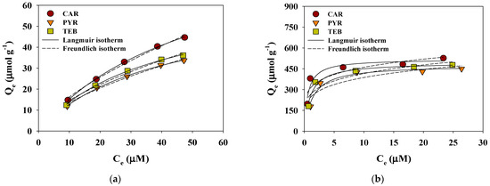 The adsorption isotherms of CAR, PYR, and TEB were investigated at five different initial concentrations (10, 20, 30, 40, and 50 µmol L−1), under fixed conditions (adsorbent dosage = 50 mg L−1, contact time = 24 h, agitation speed = 150 rpm, temperature = 25 °C, and pH = 7.0) [23].