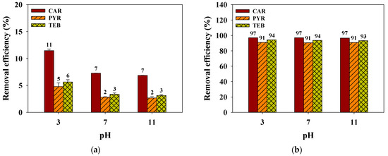 Figure 7 depicts the adsorption behaviors of CAR, PYR, and TEB for PSB and PSBOX-A at three different pH values (pH = 3, 7, and 11). The removal efficiencies of CAR (11.5% → 6.9%), PYR (4.8% → 2.7%), and TEB (5.6% → 3.1%) by the PSB were negative affected by the increase of pH values. However, the removal efficiencies of CAR (97.0% → 96.6%) and PYR (91.0% → 90.6%) by the PSBOX-A were not significantly different under the different pH values. The change in pH values strongly influenced the removal efficiency of TEB (94.3% → 93.2%) by the PSBOX-A due to the lower pKa value of TEB (pKa = 2.01) compared with the CAR (pKa = 4.28) and PYR (pKa = 3.44). Moreover, the deprotonated fungicides could promote the electrostatic repulsive interaction between the fungicides and the PSB under the pH value was higher than their pKa values [12]. These observations could explain that the electrostatic interactions between fungicides and absorbents under the different pH values played a key role in the adsorptions of the CAR, PYR, and TEB using the PSB and PSBOX-A.