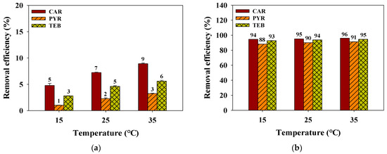 The effects of temperature (15–35 °C) on the adsorption of fungicides using PSB and PSBOX-A are illustrated in Figure 8. The removal efficiencies of fungicides using PSB (15 °C: CAR = 4.8 ± 0.4%, PYR = 1.0 ± 0.04%, and TEB = 2.8 ± 0.03%; 25 °C: CAR = 7.2 ± 0.1%, PYR = 2.3 ± 0.2%, and TEB = 4.6 ± 0.1%; 35 °C: CAR = 8.9 ± 0.1%, PYR = 3.3 ± 0.04%, and TEB = 5.6 ± 0.2%) and PSBOX-A (15 °C: CAR = 94.3 ± 0.01%, PYR = 88.2 ± 0.03%, and TEB = 92.8 ± 0.1%; 25 °C: CAR = 94.8 ± 0.02%, PYR = 90.0 ± 0.1%, and TEB = 93.8 ± 0.02%; 35 °C: CAR = 95.8 ± 0.1%, PYR = 91.3 ± 0.1%, and TEB = 94.7 ± 0.01%) increased with temperature. A similar result was observed for the removal of herbicides by ground coffee residue biochars [14]. Moreover, the adsorption behaviors of CAR, PYR, and TEB using PSB and PSBOX-A showed the same trends (CAR > TEB > PYR) under different temperature conditions. Table 5 shows the results of the thermodynamic parameters (∆G°, ∆H°, and ∆S°) for CAR, PYR, and TEB adsorption by PSB and PSBOX-A in relation to the absolute temperatures (288–308 K). The ∆G° < 0 values indicated that the adsorption process was spontaneous. The ∆H° > 0 values designated that the adsorption reaction of CAR, PYR, and TEB on PSB and PSBOX-A was endothermic [30]. Low ∆H° values (<40 kJ mol−1) might be attributed to the physical adsorption [34]. Furthermore, ∆S° > 0 values showed conducive to adsorption stability due to irreversible adsorption [35].
