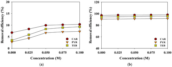 The effects of ionic strength (NaCl = 0–0.1 M) on the adsorption of CAR, PYR, and TEB by PSB and PSBOX-A are compared in Figure 9. The removal efficiencies of CAR, PYR, and TEB using PSB and PSBOX-A were progressively improved with increasing ionic strengths (PSB: removal efficiency of CAR = 6.8 ± 0.07% → 10.3 ± 0.2%, removal efficiency of PYR = 2.8 ± 0.03% → 7.3 ± 0.08%, removal efficiency of TEB = 3.5 ± 0.1% → 9.3 ± 0.05%; PSBOX-A: removal efficiency of CAR = 97.1 ± 0.02% → 98.2 ± 0.01%, removal efficiency of PYR = 90.5 ± 0.01% → 91.6 ± 0.01%, removal efficiency of TEB = 94.3 ± 0.02% → 95.6 ± 0.02%). These findings reveal that reduced solubility of fungicides with increasing concentrations of NaCl can support the adsorption capacity of PSB and PSBOX-A under different ionic strength conditions (salting-out effect) [36,37].