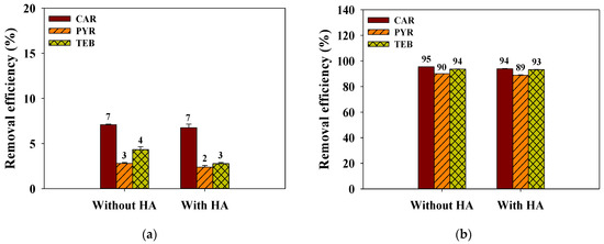 The effects of HA on the adsorption of CAR, PYR, and TEB for PSB and PSBOX-A are presented in Figure 10. HA, macromolecular compounds with many reactive functional groups, might scavenge the binding sites generated on PSB and PSBOX-A. Thus, HA used in the batch experiments could affect the adsorption affinity of fungicides with adsorbents [38]. The removal efficiencies of CAR, PYR, and TEB by PSB are similar to the existence of HA (removal efficiency without HA: CAR = 7.1 ± 0.07%, PYR = 2.8 ± 0.09%, and TEB = 4.3 ± 0.3%; removal efficiency with HA: CAR = 6.8 ± 0.3%, PYR = 2.4 ± 0.2%, and TEB = 2.8 ± 0.1%). The removal efficiencies of CAR, PYR, and TEB using PSBOX-A are not significantly affected by the presence of HA (removal efficiency without HA: CAR = 95.2 ± 0.02%, PYR = 89.7 ± 0.07%, and TEB = 93.7 ± 0.02%; removal efficiency with HA: CAR = 93.8 ± 0.3%, PYR = 88.9 ± 0.3%, and TEB = 93.3 ± 0.07%). These observations suggested that the adsorption behavior of CAR, PYR, and TEB by PSB and PSBOX-A were outcompeted by HA adsorption [12].