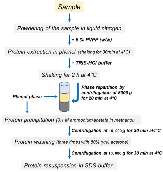 - Faurobert, M.; Pelpoir, E.; Chaïb, J.; Valerie, M.; Catherine, D.; Michel, Z.; Hervé, T. Phenol Extraction of Proteins for Proteomic Studies of Recalcitrant Plant Tissues. In Plant Proteomics; Springer: Berlin, Germany, 2007; Volume 355, pp. 9–14. [Google Scholar]