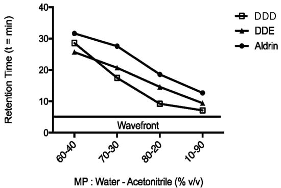 The optimal percentage of water and ACN constituting the mobile phase was chosen based on the RT values of analytes, until an excellent separation of peaks was obtained in the shortest chromatographic run (15 min). Indeed, the initial percentage of ACN (60%) was increased up to 90% (Figure 2), when peaks of interest were approximately 2 min apart from each other. The RT values were 7.0, 9.4 and 12.7 min for DDD, DDE and aldrin, respectively. Moreover, an ACN percentage of 90% ensured a faster elution of analytes than other mobile phases evaluated, so that the total run length was 15 min. These characteristics allowed a good separation of peaks among themselves from the wavefront, while ensuring an optimum turnaround time (TAT) [16].