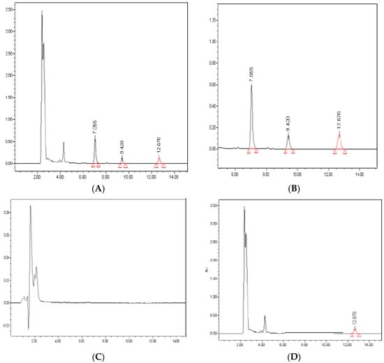 Representative chromatograms. Peaks of DDD (20 mg/L; 7.055 min), DDE (1 mg/L; 9.420 min) and aldrin (100 mg/L; 12.676 min) are identified in a plasma sample spiked with the analytes (panels A and B). Blank plasma sample (panel C), chromatogram of a plasma sample spiked with IS (100 mg/L) (panel D). Retention Time in minutes.