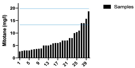 Mitotane (DDD) plasma concentrations. Therapeutic range of DDD (14–20 mg/L) was reached in 4 out of 30 samples.